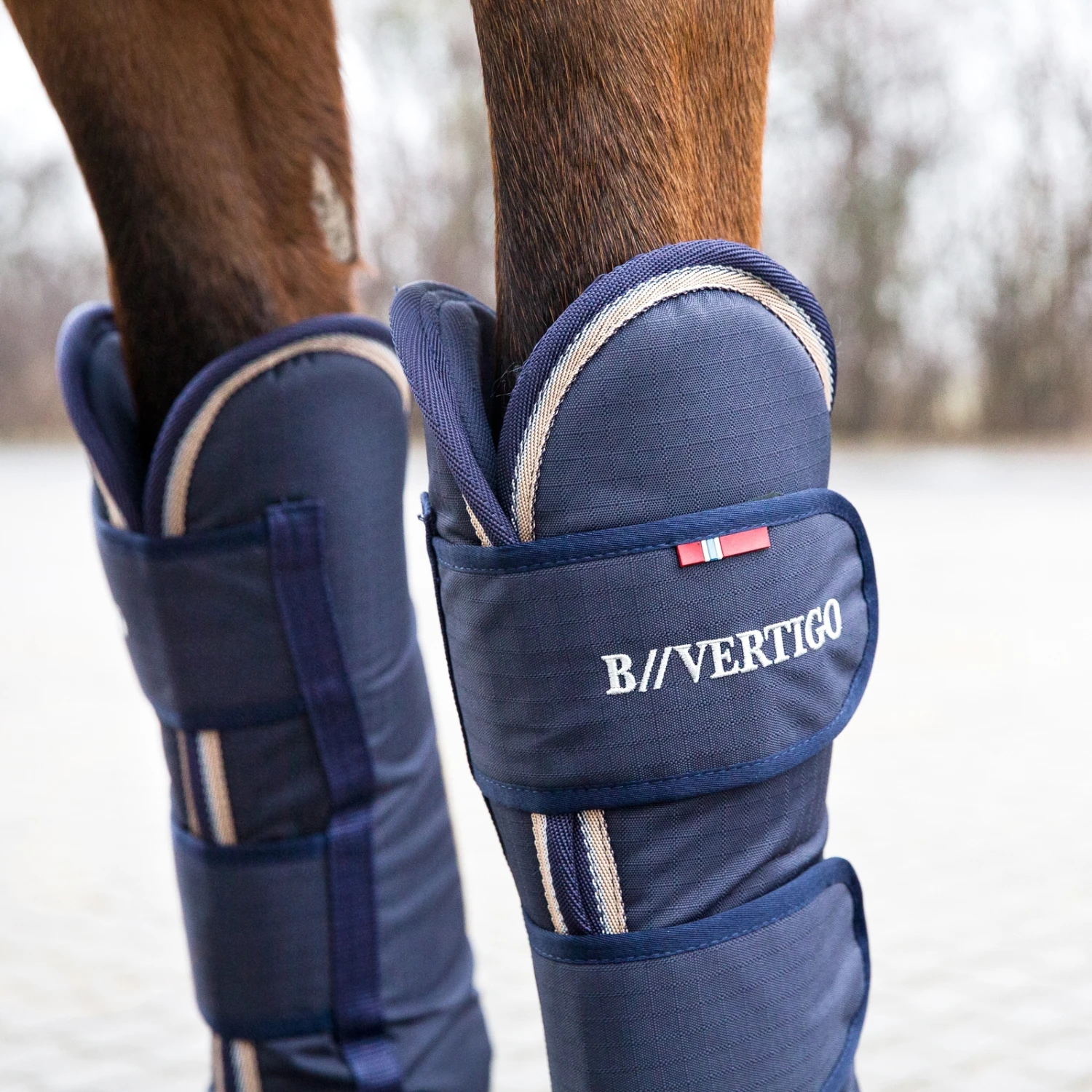 - Der untere Teil der Gamaschen ist verstärkt, damit die Hufeisen abgeschirmt werden und um somit Verletzungen während der Fahrt zu verhindern