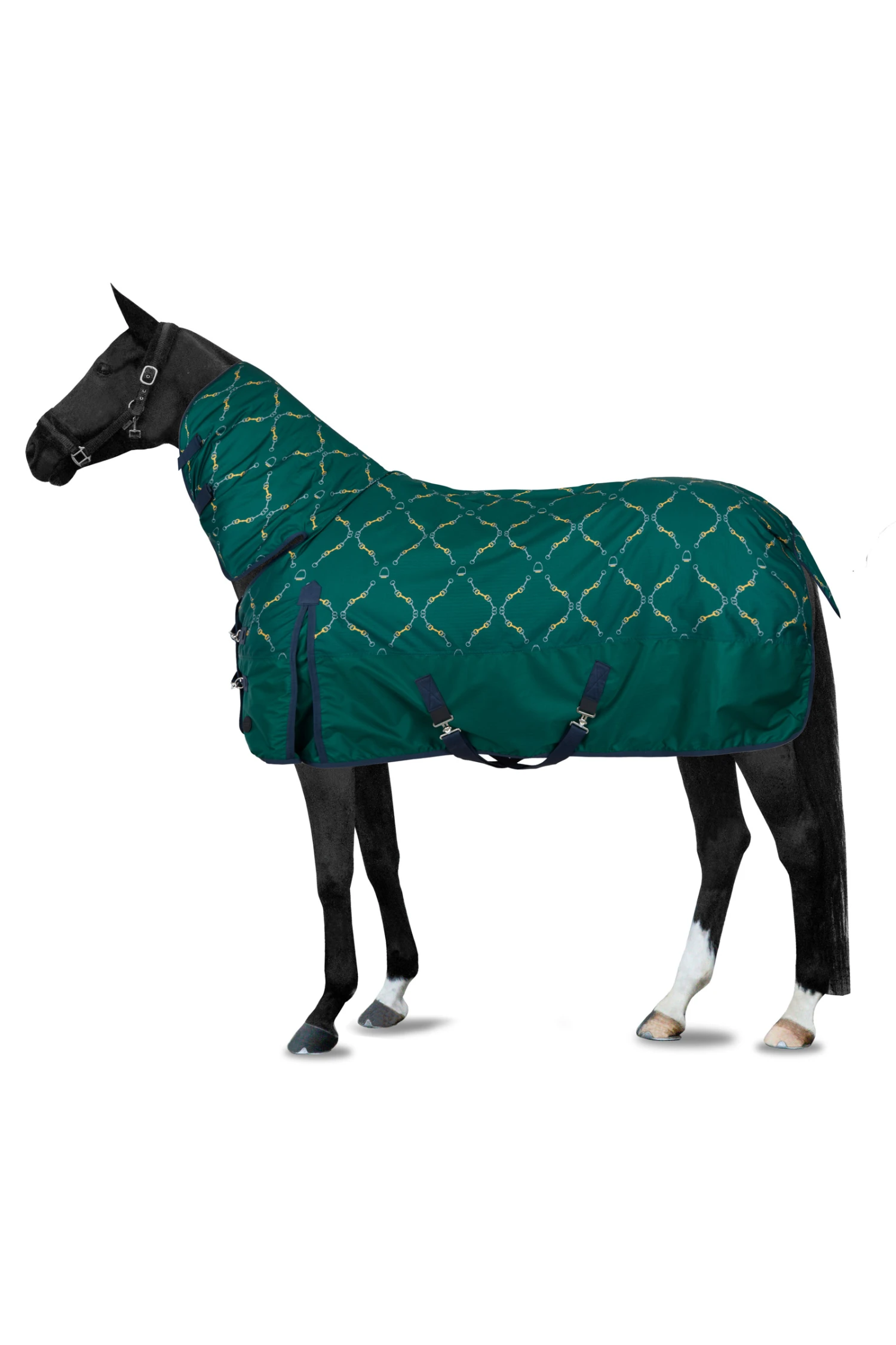 Decke dein Pferd mit dieser schönen Decke ein, um es vor Kälte und Regen zu schützen. Sie ist aus strapazierfähigem Stoff mit Gebissprint gefertigt und mit zwei Vorderschnallen, Beinriemen, Kreuzgurten und einem Schweiflatz ausgestattet. Hohe Gehfalten schränken die Bewegungsfreiheit deines Pferdes nicht ein. Das Halsteil schließt leicht mit Klettverschlüssen. Auch ohne Halsteil erhältlich.